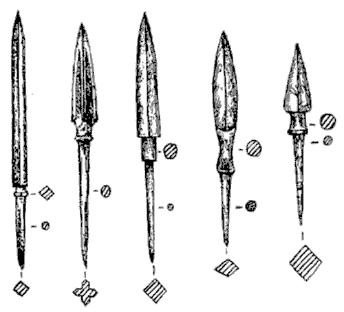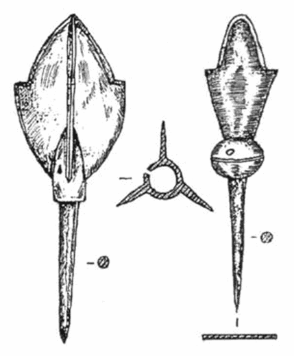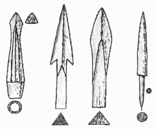 В бронзовом веке процесс изготовления наконечников стрел стал более совершенным: наряду с уже знакомыми наконечниками все шире стали использоваться более тяжелые (при тех же размерах) наконечники из бронзы. В ту пору они преимущественно были снабжены тремя лопастями, что придавало стреле большую устойчивость в полете (рис. 3).
