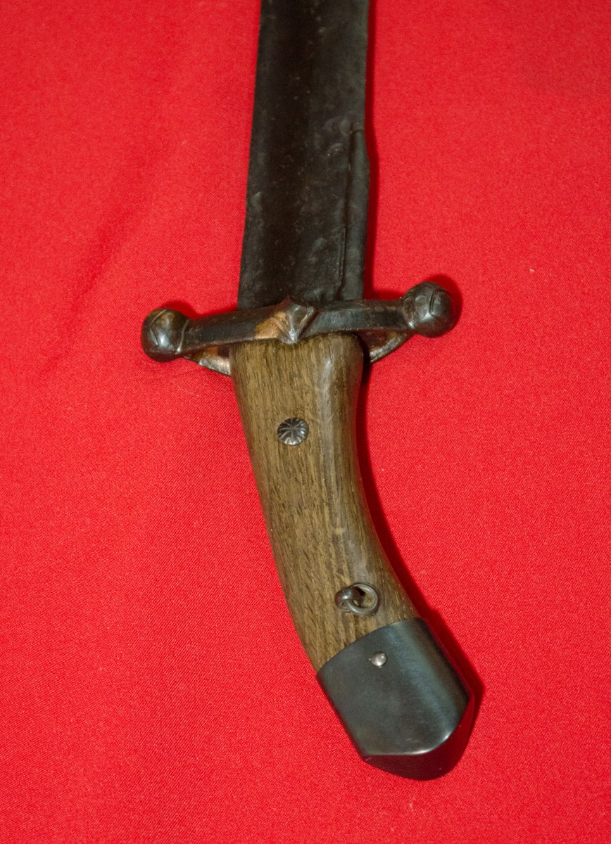 Учитывая что все процессы в реставрации должны быть обратимыми,то необходимо рукояти всегда делать разборными. Поэтому используется в штифтах не расклёп,а резьбовое соединение. Отсутствовала перегородка в гарде и родное окончание было заменено на аналогичное из мельхиора.