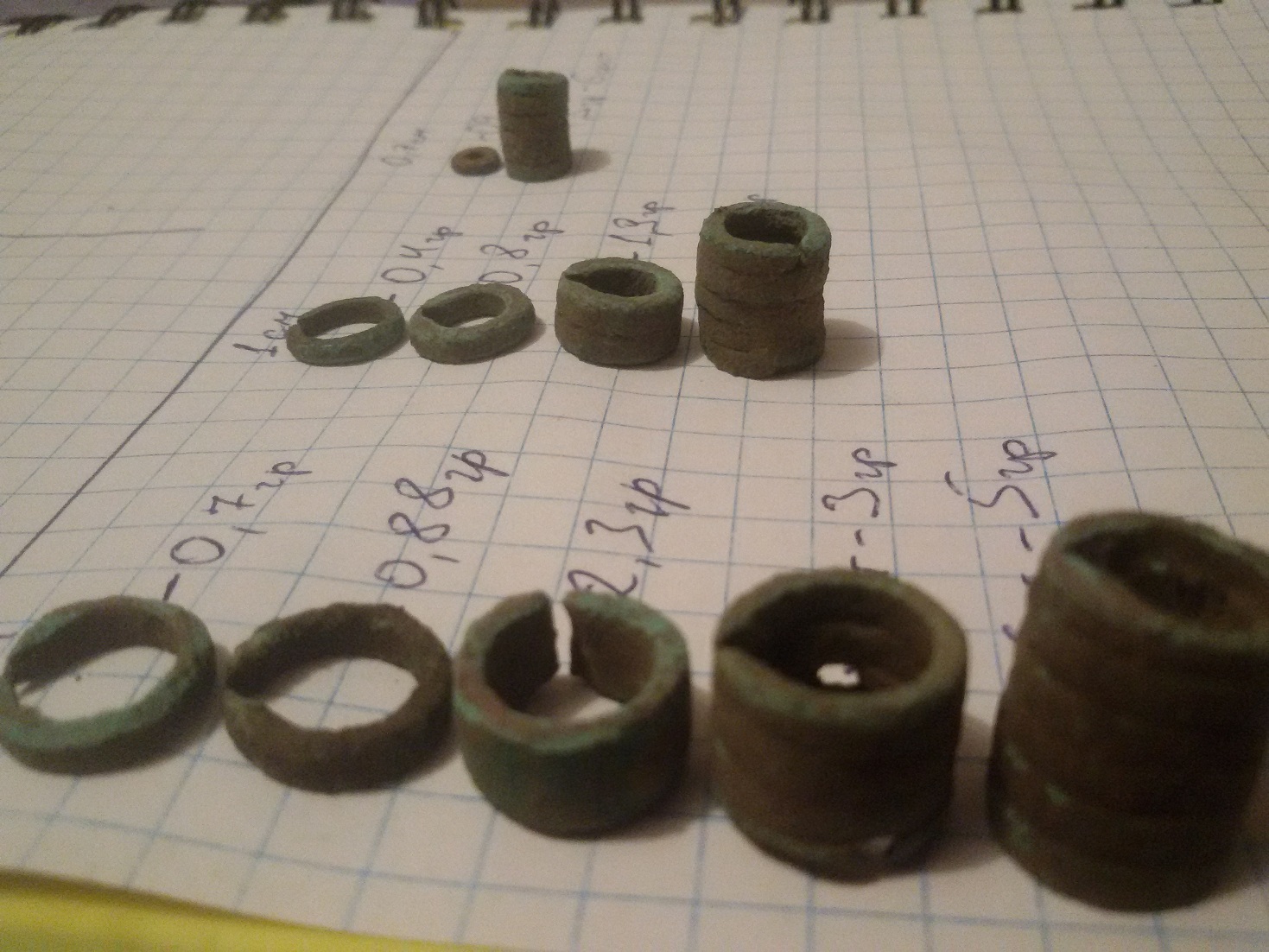 Шановний merinSV могли б Ви зважити окремі кільця та спіралі одного діаметру? Є припущення що це грошова одиниця трипілля, а різний діаметр та спіралі були різновидами номіналу.