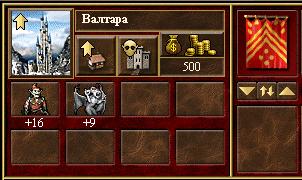 Слева направо: Кнопка улучшения прироста существ в замке Кнопка создания золотого запаса Кнопка покупки всех существ в замке Кнопка банка Кнопка перемещения отрядов герою гостю Кнопка обмена отрядами между героем гостем и гарнизоном города Кнопка перемещения отрядов в гарнизон города |