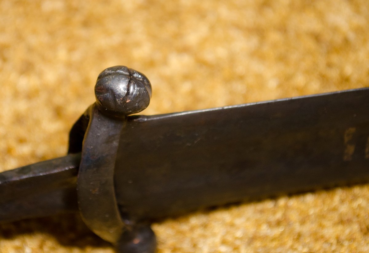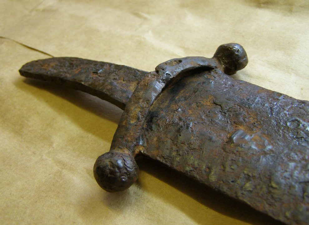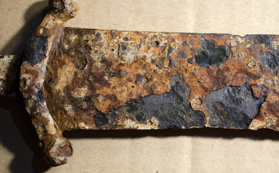 После сушки началась рутинная расчистка и вышлифовка поверхности. Хорошо стала просматриваться конфигурация самого клинка. На гарде прорисовались вот такой крестообразный декор.