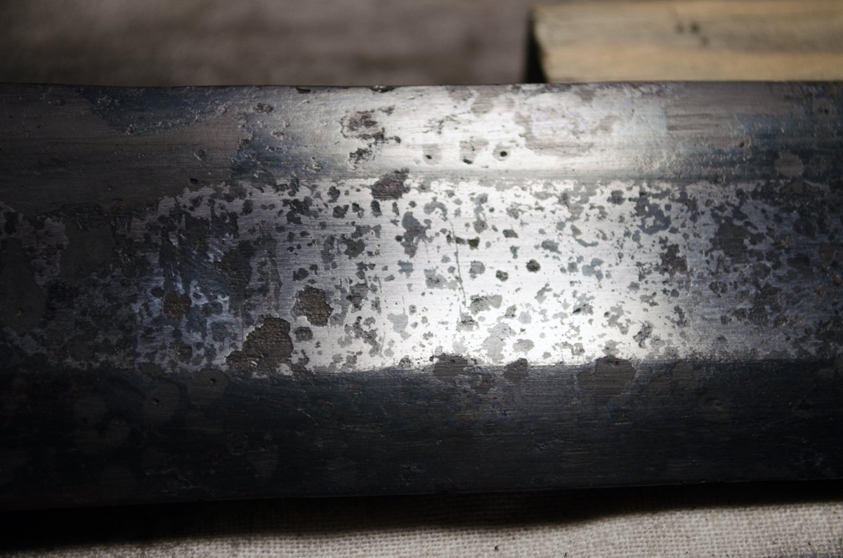 Разница металла была найдена,а дальше начал подбирать препараты которые смогли бы успеть вступить в реакцию с более мягким металлом раньше чем с более твёрдым. Вот фото обоих сторон клинка. Одна сторона надпись +WLFBERHT+, вторая сторона I I I I I I I IXIXI