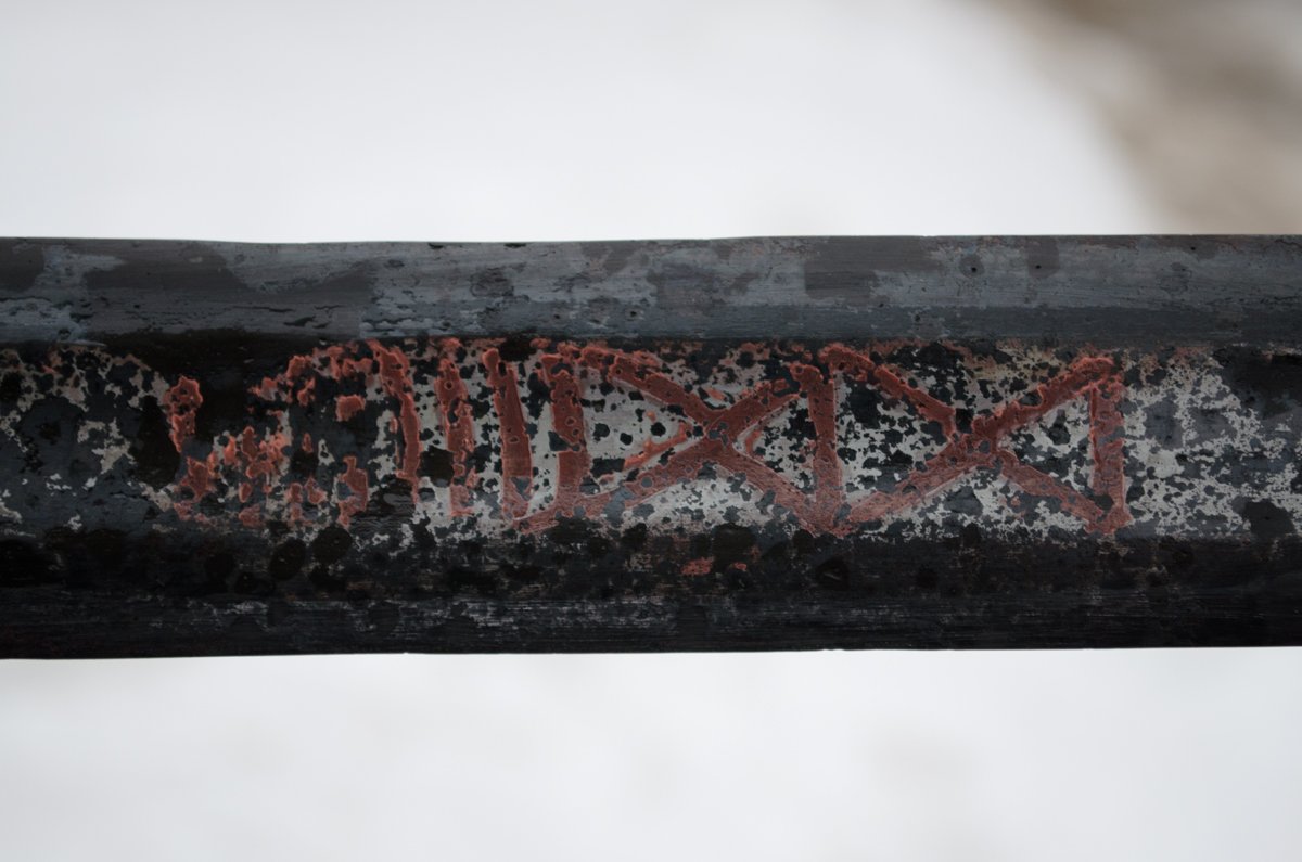 Кажется придумал как проявить все меты на мече. Вот фото фрагмента где хорошо видно в каком порядке укладывалась всекаемая проволока. Специально перевёл фото в чёрно-белые тона для более полного понимания картинки.