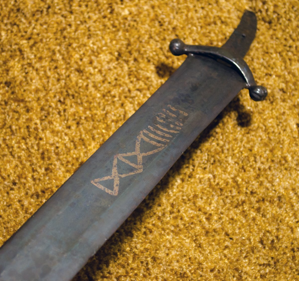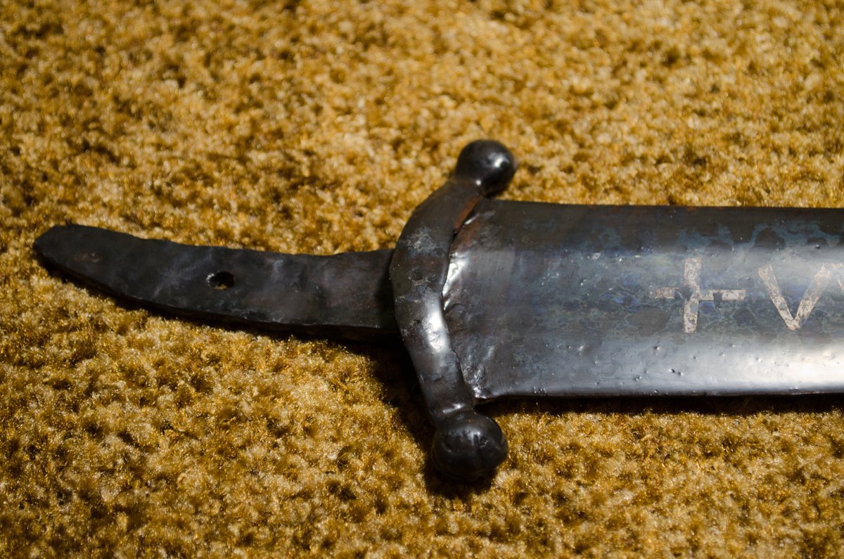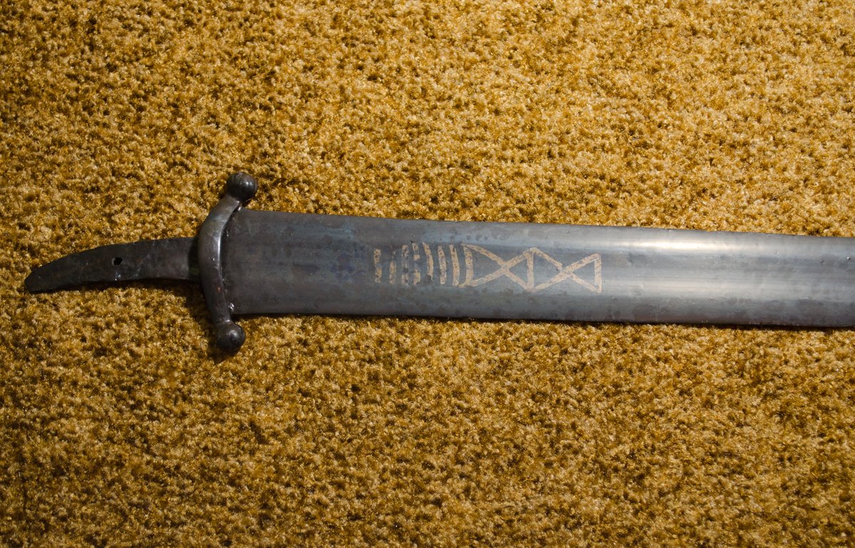 И тут началось самое интересное. Занимался последней шлифовкой и доводкой клинка,так ничего на нём и не обнаружив интересного кроме крестообразных насечек на шариках гарды,как супруга проходила мимо и говорит что на клинке видит иксы. Думали глюк. Ан,нет - под определённым углом освещения увидели иксы и поперечные риски. Совсем непонятно стало как это может быть. Перевернули клинок другой стороной,и под тем же углом увидели и ахнули надпись. На фото очень тяжело передать видимое под углом,но кажется всё же видно. Поднял книгу Кирпичникова и просто прозрели. Цитата – «Удивительное обилие надписей и знаков, проступивших вдруг на вещах, давно и хорошо известных, объясняется производственными особенностями клеймения. Это звучит почти неправдоподобно, но волшебное свойство мет заключается в том, что в зависимости от сохранности и ухода они могут то исчезать, то появляться вновь. Надписи и знаки на изделиях IX-XIII веков располагались в верхней трети клинка, они были инкрустированы в горячем состоянии железной или дамаскированной проволокой. Даже на полосе, очищенной от коррозии, начертания почти неразличимы».