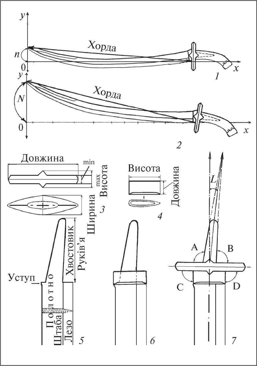 Приведенные способы измерений мы считаем неправильными, так же как и процесс сборки. Поэтому предлагаем принципиально иную систему измерений. Для выяснения соотношения углов мы (теоретически) разместили саблю в систему координат. В первом варианте крестовина размещена под прямым углом к ​​оси х (рис. 1, 1), и отрицательные показатели оси х отражают глубину кривизны лезвия. Во втором варианте (рис. 1, 2) лезвие до начала его искривления размещено на горизонтальной поверхности (оси х). Таким образом получена система координат, где ху – кривизна полосы, угол n – подъем острие над осью х, а угол N – угол подъема острие над лезвием. В обоих вариантах имеет значение система координат, хорда и углы. Измерение на конкретных образцах клинкового оружия1 параметров х, у, ху и углов n, D и N и соотношение их между собой позволил выявить ряд закономерностей и установить роль обоймы, а именно: