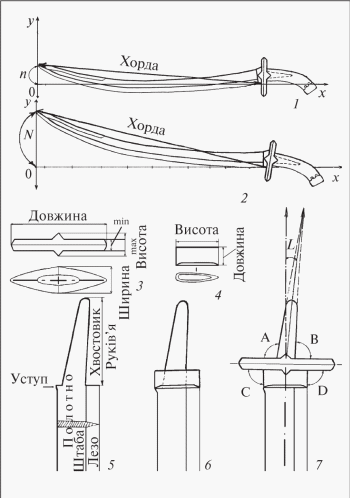 1, 2 – методика измерения клинка; 3 – крестовина; 4 – обойма; 5 – основные элементы полотна; 6 – место расположения обоймы; 7 – принятая система измерения угла наклона хвостовика рукоятки к лезвию