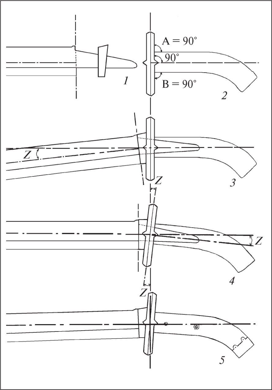 Ранняя сабля – это универсальное оружие с одинаково эффективными ударами обоих свойств. Поэтому считаем некорректным выяснять угол наклона хвостовика рукоятки к лезвию. При отсутствии рукоятки и невозможности установить её конфигурацию и расположение (отсутствует навершие) важно определить угол наклона эфеса в целом (крестовины и рукояти) к лезвию (рис. 4). Правильный, на наш взгляд, технологический процесс монтажа эфеса приведены на рис. 2 и 3. В соответствии с этим измерения угла наклона рукоятки и эфеса к лезвию должно выполняться, как показано на рис. 4. Также очевидно, что угол Z (угол наклона эфеса к лезвию в сабле) должен быть меньше или равен углу N, то есть углу подъема острие над лезвием. Таким образом, искривление полосы – это график ху, а кривизна клинка в градусах в целом – сумма углов S и N.