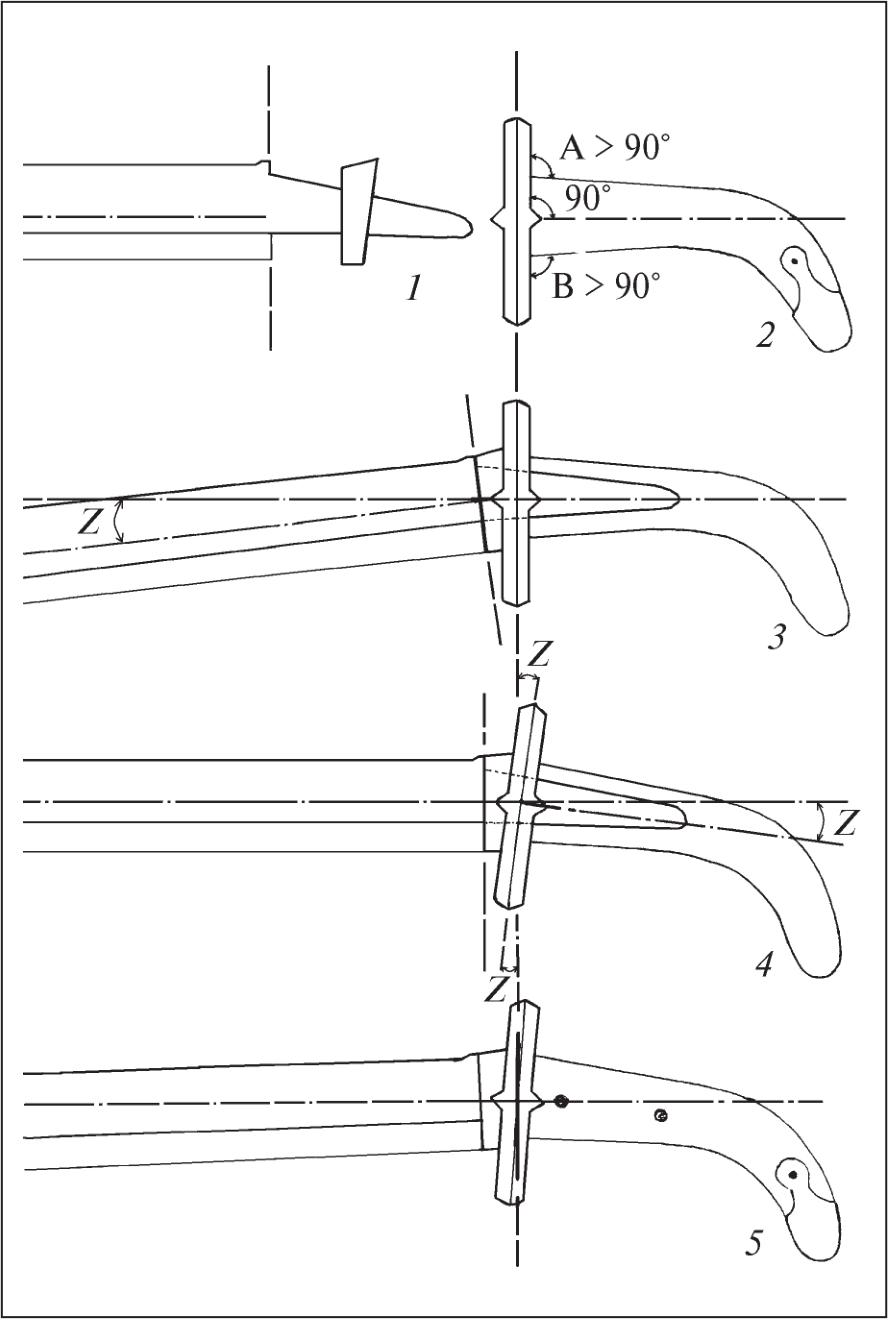 - Ось эфеса не является продолжением оси полотна, иначе говоря, ось полосы не совпадает с осью эфеса (рис. 2, 3-5; 3, 3-5);