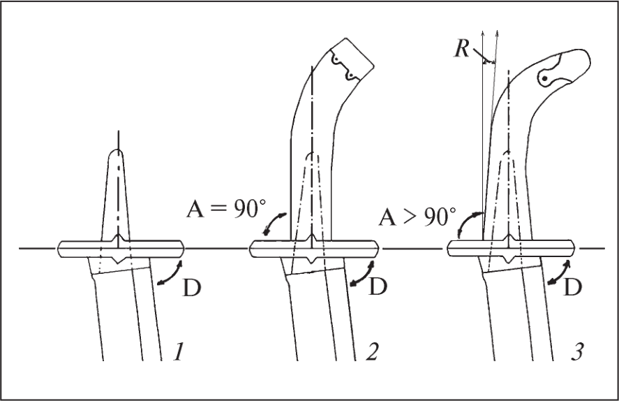 - Угол между крестовиной и лезвием (D) менее прямой (рис. 4, 1);