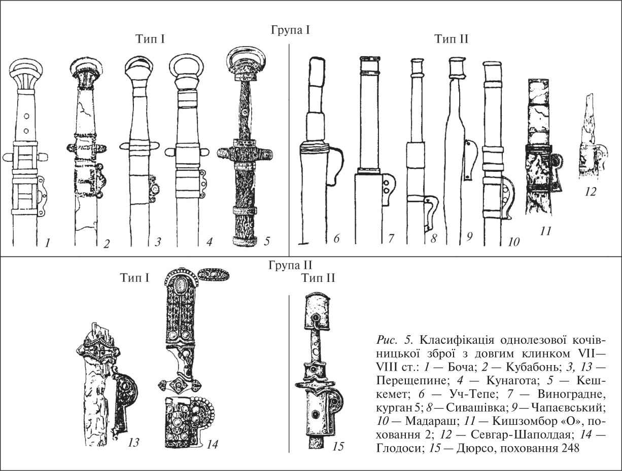 Источник: А.М. Голубєв, І.В. Голубєва ОДНОЛЕЗОВА ЗБРОЯ З ДОВГИМ КЛИНКОМ КОЧОВИКІВ VII-VIII cт. // Археологія, 2012, № 4 (перевод swordmaster.org)