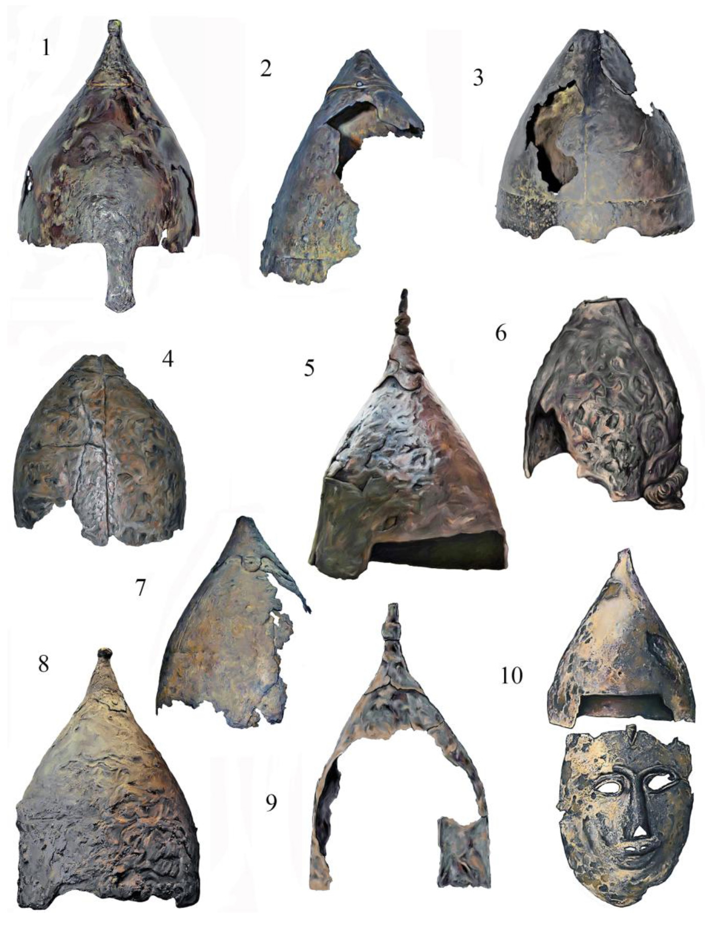 Сфероконические шлемы со шпилем и «яблоком»: 1 – шлем с территории Украины, Государственный Эрмитаж; 2 – Демьяновка; 3 – Екатеринослав; 4 – Праздничный; 5 – Прикубанский-1; 6 – Бурты; 7 – Мировка; 8 – Ладожская; 9 – Хавалы IV; 10 – Куйбышево (рисунок автора)