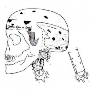 Интересное захоронение раскопано в Белоруссии, близ с. Юдичи [2]. В кургане 1, в золистом слое на материке обнаружено женское погребение, ориентированное головой на запад. Скелет почти полностью истлел. Лучше сохранился череп (рис. 1). На нем находился луб, покрытый в отдельных местах фрагментами тонкой ткани полотняного переплетения из посконной нити [3]. На лбу ткань была украшена полосой бус. Это — мелкие стеклянные зонные бусы желтого цвета и просверленные вишневые косточки. Бусы, очевидно, были нанизаны на нить и затем прикреплены к ткани (рис. 2). У правого виска находилось 3 семилучевых и 4 перстневидных височных кольца, а у левого – 5 семилучевых и 1 перстневидное височное кольцо. Височные кольца у левого виска сохранились вместе с кожаной лентой, на которой они крепились. Так как насыпь кургана была песчаной, то при расчистке лента с височными кольцами упала и перевернулась вместе с осыпавшимся песком. При этом лента разорвалась на две части, края которых по месту разрыва сходятся (рис. 1). О ее местоположении на черепе говорит сохранившийся след от окисла металла, давший четкий отпечаток на черепе. На рисунке 1 пунктиром отмечено место, где находилась лента. Это область виска и уха. Лента сложена вдвое. 4 височных кольца проткнуты в нее один над другим, нижнее подвешено в месте сгиба ленты. Об аналогичном креплении ссмилучевых височных колец сообщал П. М. Еременко, копавший курганы в Черниговской губернии в конце прошлого века: «...кольца найдены продетыми через полоску кожи, на одинаковом расстоянии одно ниже другого...» [4] Наиболее интересным в данном погребении представляется сочетание височных колец на кожаной ленте с головным убором на жесткой основе и с украшенным очельем. Нельзя утверждать, что описанный здесь женский головной убор был цельным. Даже в XIX-XX вв. известны женские головные уборы, состоявшие из самостоятельных частей — налобника, позатыльника, сороки и т. д. Однако здесь налицо те элементы, из которых складывается единый головной убор — кокошник (украшенное очелье, ткань, покрывавшая волосы, жесткая основа, сохранившаяся в районе затылка).