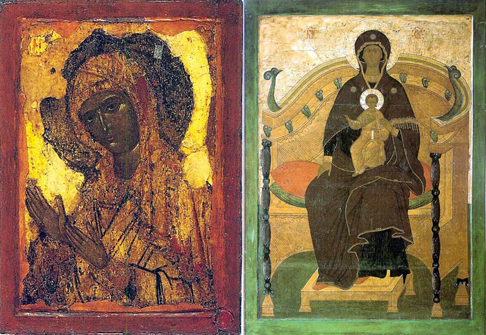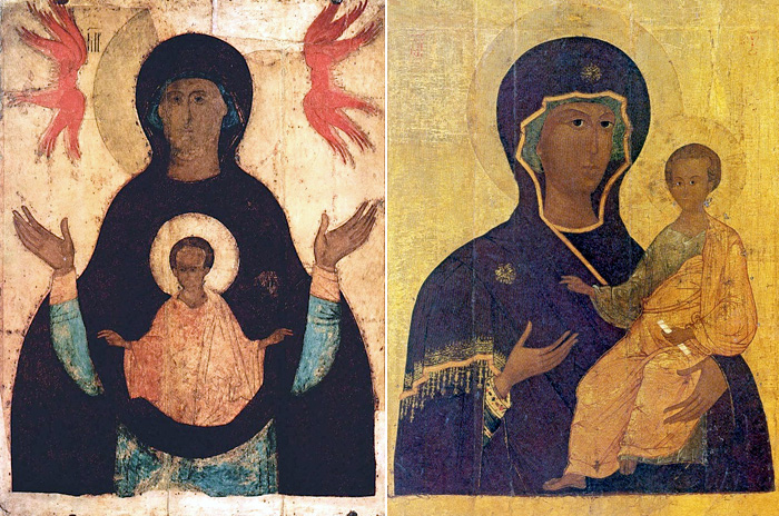 (Рис.5.) Иконография Богоматери. 3 – Богоматерь Знамение, икона XV в.; 4 – Богоматерь Одигитрия Смоленская, икона XVI в.