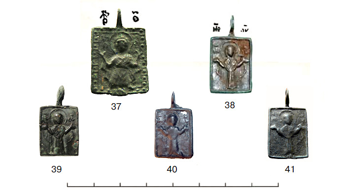 В Каталоге представлено пять экземпляров иконок-привесок, относящихся к данной подгруппе (табл. IV, 37–41). Все они имеют прямоугольную форму (тип 3), найдены на исторической территории Киевской Руси и датируются домонгольским временем. По мнению Ю.Э. Жарнова (2000, с. 191), прообразами их композиции были изображения Богоматери на актовых печатях русских церковных иерархов конца XII – первой трети XIII в., хотя вполне возможно и прямое заимствование сюжета непосредственно с памятников монументальной или темперной живописи.