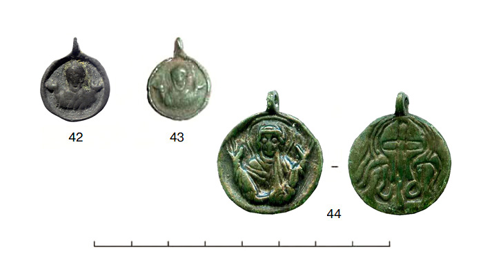 В недавнее время стали известны так же амулеты-привески в виде фигурки Богоматери на Престоле (рис. 15, 1, 2). Находки их единичны, и все они сделаны на исторической территории Киевской Руси. В настоящее издание они не во шли.