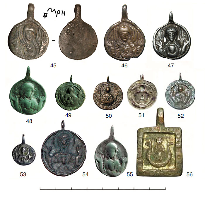 На иконках-привесках этой под группы, представленных в Каталоге (табл. IV, 45-56), находятся погрудные и поясные изображения Богоматери с молитвенно воздетыми руками и изображением на груди Младенца Христа. Иконки имеют круглую, овальную и прямоугольную формы и относятся к периоду времени от XII–XIII вв. до первой половины XV в. Подавляющее большинство публикуемых иконок найдено на исторической территории Киевской Руси.