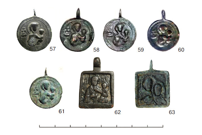 Иконки-привески данной под группы, представленные в Каталоге (табл. V, 57-63), имеют круглую и прямоугольную формы, относятся к домонгольскому времени и найдены главным образом на исторической территории Киевской Руси.