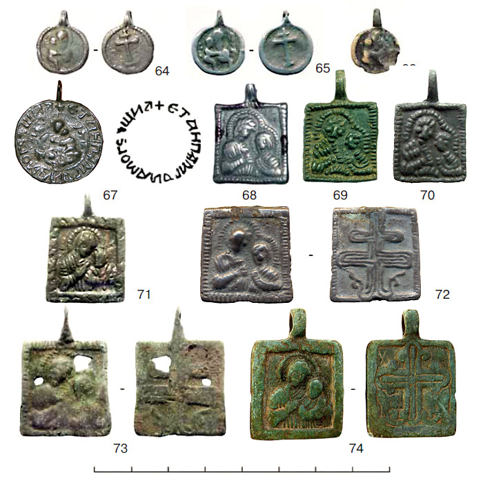 В годы, последовавшие за Крещением Руси в конце X в., иконки-привески с изображением Богоматери, как и иконки с изображением Христа, по-видимому, копировали византийские образцы. В XII в. появились иконки-привески, воспроизводящие в уменьшенном виде собственно русские святыни. Отдельные иконографические типы богородичных изображений становятся как бы закрепленными за определенными центрами, чаще всего столичными. В частности, на памятниках домонгольского времени нередко встречаются прямоугольные иконки-привески с изображением Богоматери Умиление типа Корсунской или Петровской (табл. V, 68-74). В различное время они были найдены во Владимирской, Ивановской, Костромской и Ярославской областях, в курганных могильниках Подмосковья, на Белом озере, в Житомирской и Львовской областях Украины и в других местах. Все они происходят из двух различных литейных форм или являются репликами изделий, вышедших из этих форм. М.В. Седова считает эти иконки произведениями литейщиков Владимиро-Суздальской Руси (Седова М.В., 1974, с. 192-194), хотя на ходки подобных иконок имеются и на всей исторической территории Киевской Руси.