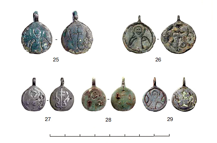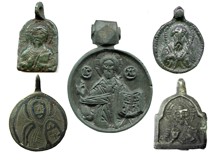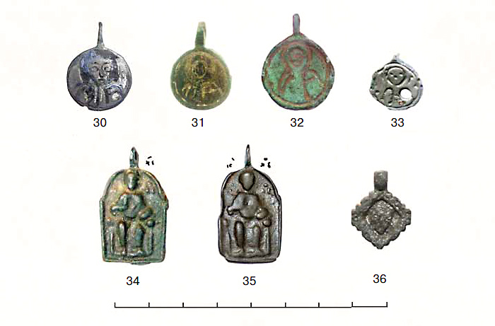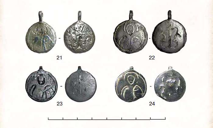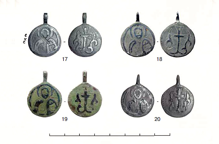 Иконки-привески с изображением Господа Вседержителя, вошедшие в Каталог, (табл. I, 6-16; II, 17-24; III, 25-33) чаще всего имеют круглую форму, реже – прямоугольную, киотчатую и арочную формы. В подавляющем большинстве случаев они относятся к домонгольскому времени, в том числе уникальная рельефно-ажурная иконка XI-XII вв. (табл. I, 16), и найдены, за некоторыми исключениями, в пределах исторической территории Киевской Руси.