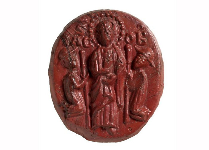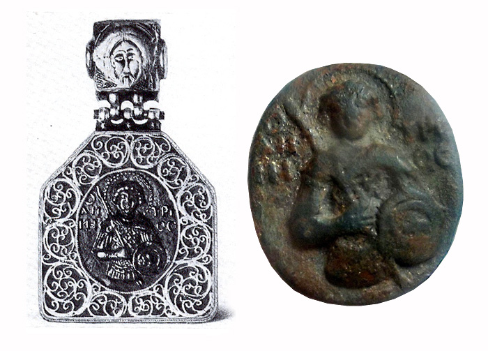 Вторая иконка Русского музея — из красного стекла с таким же сюжетом- и композицией — имеет меньшие размеры (2,8x2 см) (рис. 5). В одной форме с ней отлиты литики из Британского музея, музеев Филадельфии и Принстона, а также из собора в Сплите. Иконка из темно-красного глухого стекла (2,8x2 см) с поясной фигурой св. Софии и греческой надписью H A С0ФIА (рис. 6) идентична иконкам из Калиакры и Бостонского музея изящных искусств и отлита с ними в одной форме.