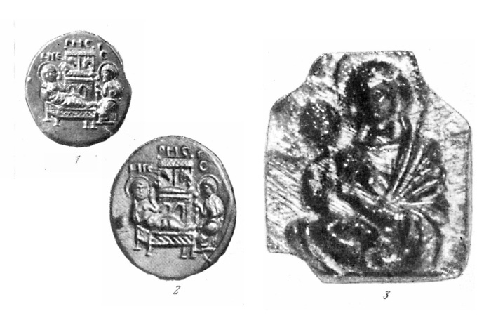 Существуют стеклянные иконки меньшего размера с аналогичным сюжетом и композицией, но в зеркальном отображении. При раскопках Сарая — первой столицы Золотой Орды (середина XIII-XIV вв.) — среди подъемного материала найдена квадратная иконка из зеленого стекла (2x1,7 см), на которой высоким рельефом изображена богоматерь с младенцем на правой руке (рис. 3). По каталогу Вентцеля известны восемь типов с таким же сюжетом, но ни один из них не соответствует иконке из Сарая.