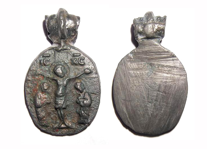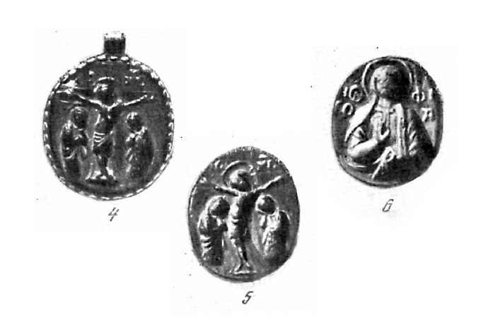 В Отделе древнерусского прикладного искусства Гос. Русского музея хранятся три овальных литика. На иконке из черного стекла в серебряной оправе (3,5x2,8 см) виден распятый Христос с двумя предстоящими фигурами и греческой надписью IС XC (рис. 4). Этому литику аналогичны иконки из коллекций в Думбартон-Оксе, Британском музее, музеях Мадрида и Филадельфии, а также из коллекции Кибальчича, которая включала в себя 12 южнорусских находок.