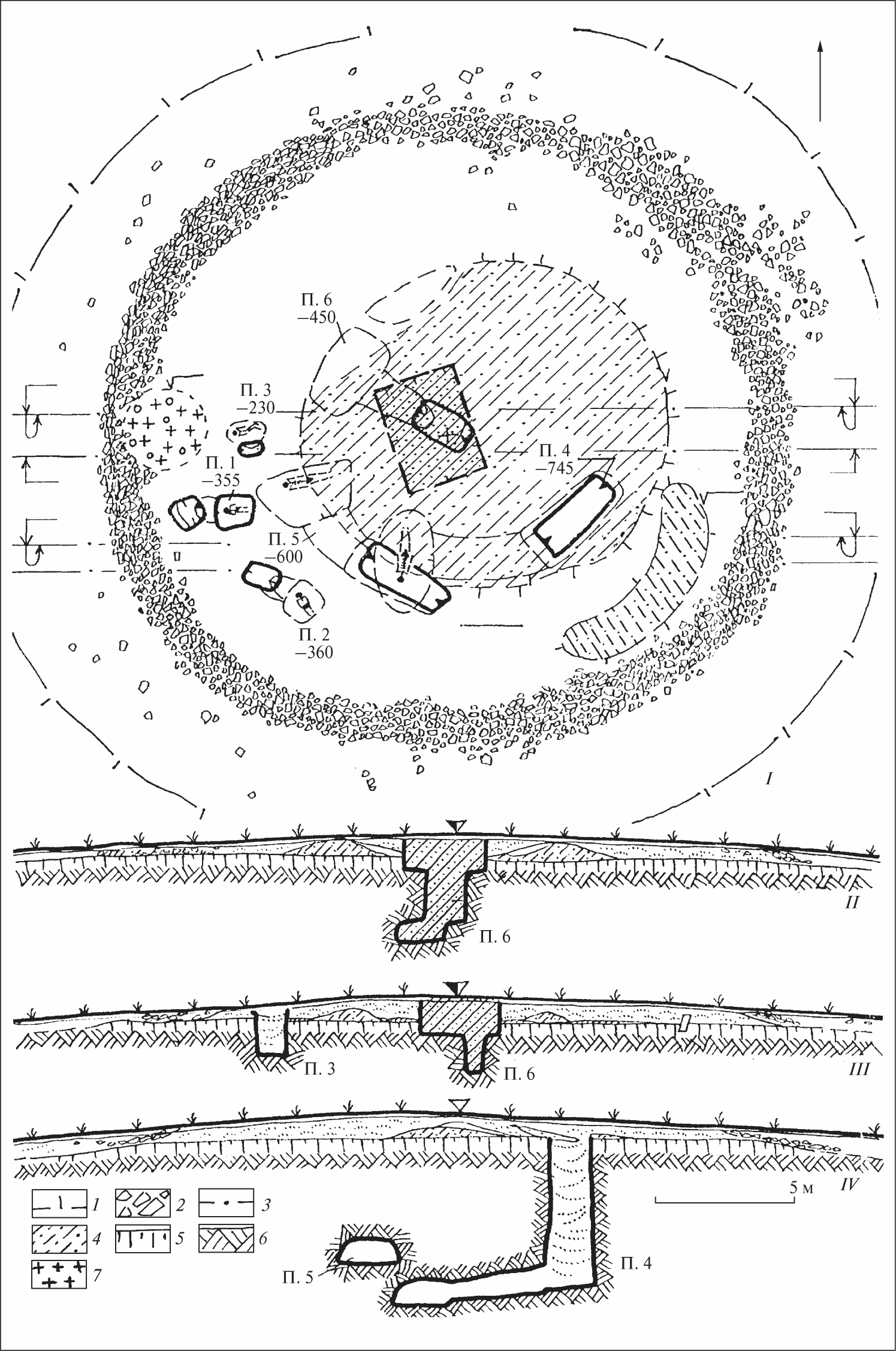В кургане обнаружено шесть захоронений. Основное захоронение 6 окружал материковый выброс из могилы, впускные захоронения 1-5, устроены по кругу, концентрировались в юго-западном секторе. Локализация не в центре кургана спасла их от ограбления.