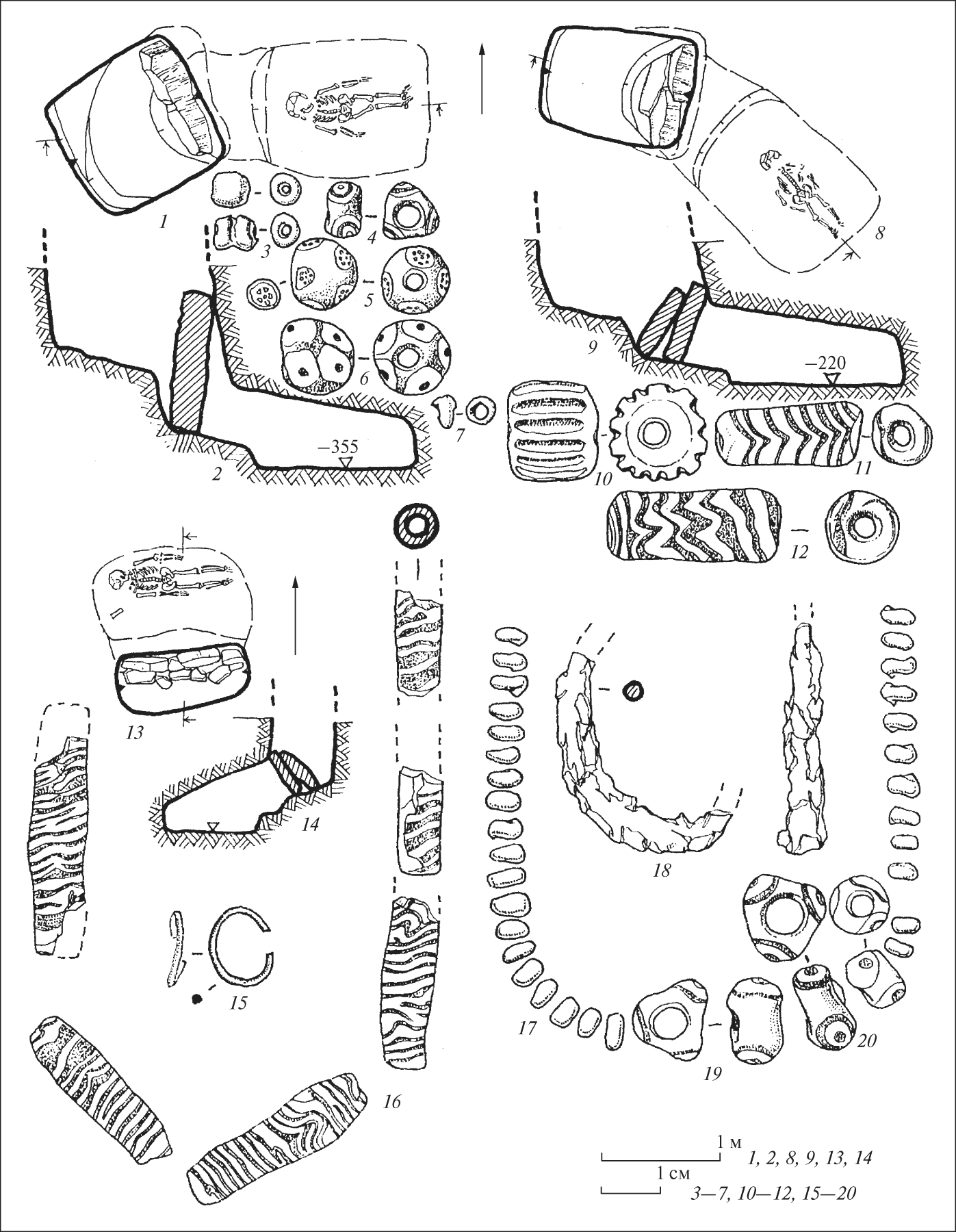 Захоронение 1 (рис. 2, 1, 2) размещалось в западной части кургана и было совершено в катакомбе. Квадратная в плане входная яма, 1,4×1,4 м, ориентирована углами по сторонам света. На глубине 2,4 м вдоль западной стены была ступенька шириной 0,3 м; еще одна, шириной 0,6 м – на глубине 0,4 м, а третья, шириной 0,8 м – на глубине 3,25 м. Вход в камеру (высота 0,6 м, ширина 1,0 м, длина 0,3 м) был выкопан в восточной стене ямы и закрыт каменной плитой. Прямоугольная в плане захоронения камера, 1,5×1,2 м, высота 0,6 м, направленная к центру кургана. Ее глубина 3,55 м, на 0,30 м ниже дна дромоса. Костяк ребенка 12 лет лежал вытянутая на спине головой на запад – к выходу. В области шеи зафиксировано скопление бусин.