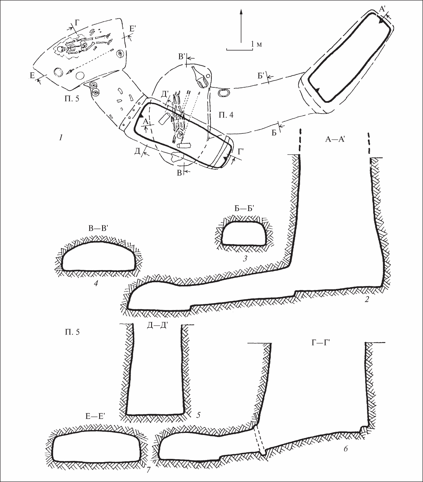 Малая Лепетиха, курган 10. План и сечения захоронений 4 и 5 Малая Лепетиха, курган 10. Погребение 4, план