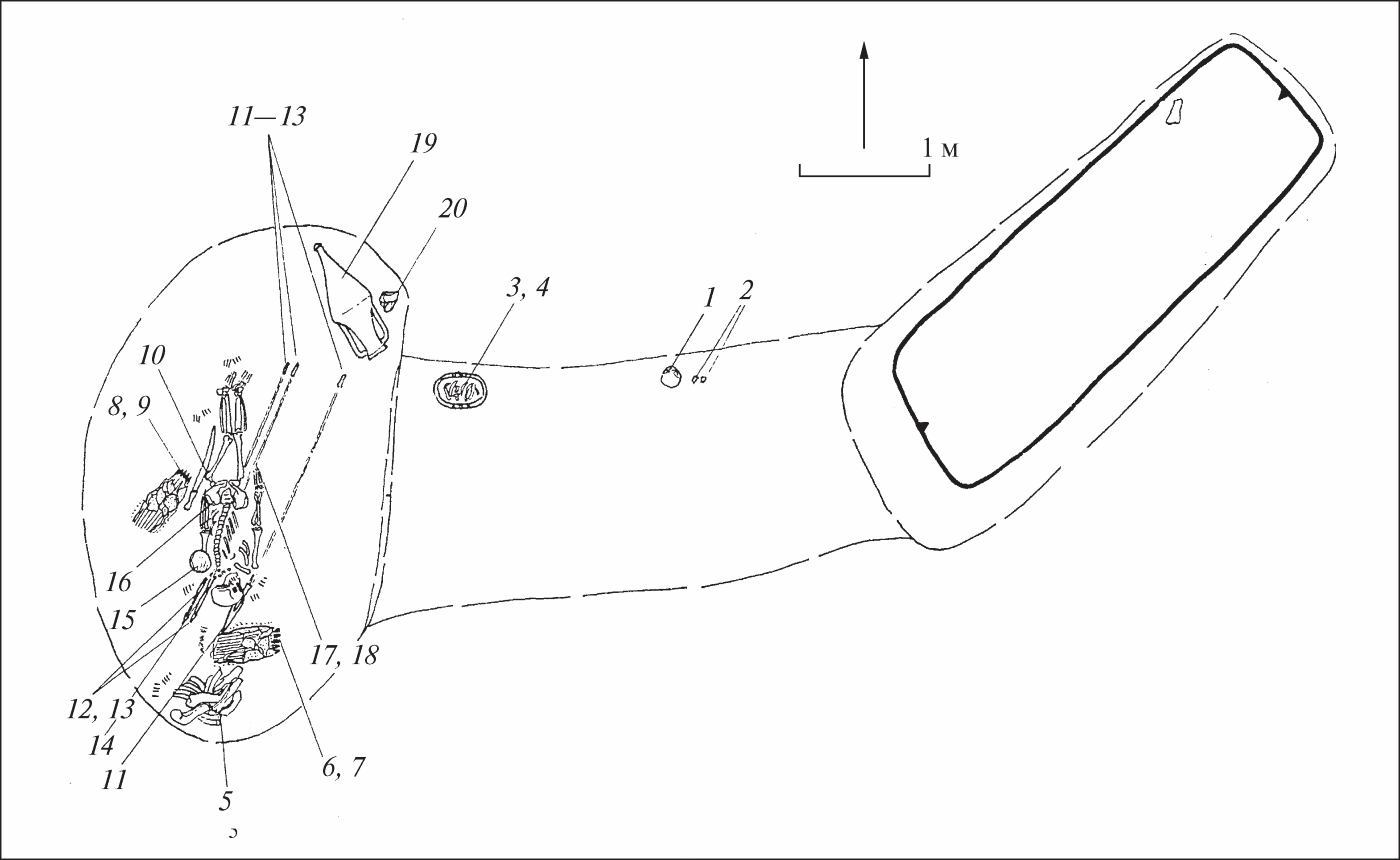 Малая Лепетиха, курган 10. Детали уздечки по захоронению 4 Малая Лепетиха, курган 10. Погребение 5: 1 – котел; 2 – план
