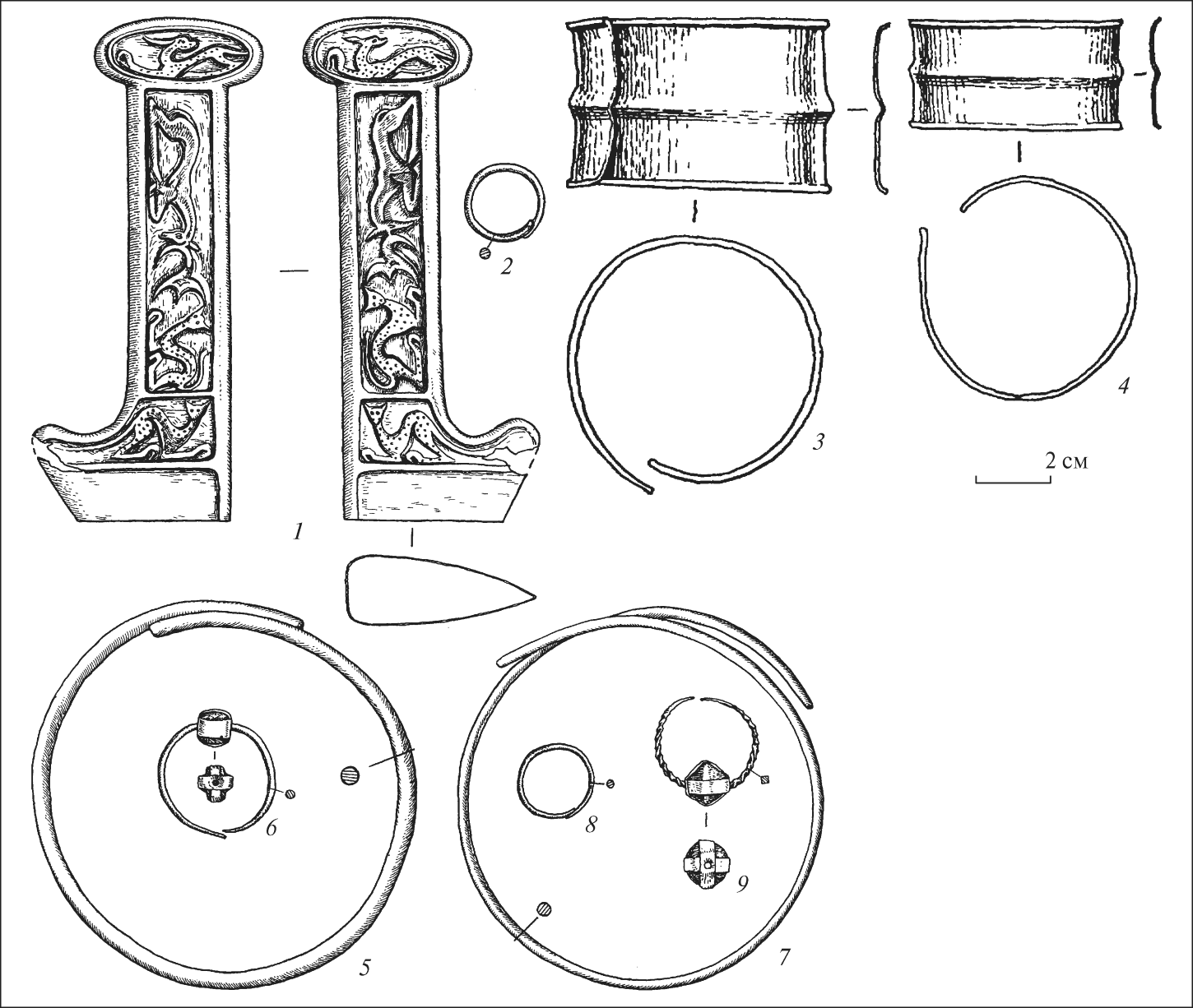 16. Браслет из золотой пластины 500-й пробы с отогнутыми бортиками и ребром в центре сохранился в двух фрагментах. Концы несколько заходят один за другой. Диаметр 5,0-6,7 см, ширина 4,4-4,7 см, вес 45,3 г (рис. 7, 3, 16, 9).