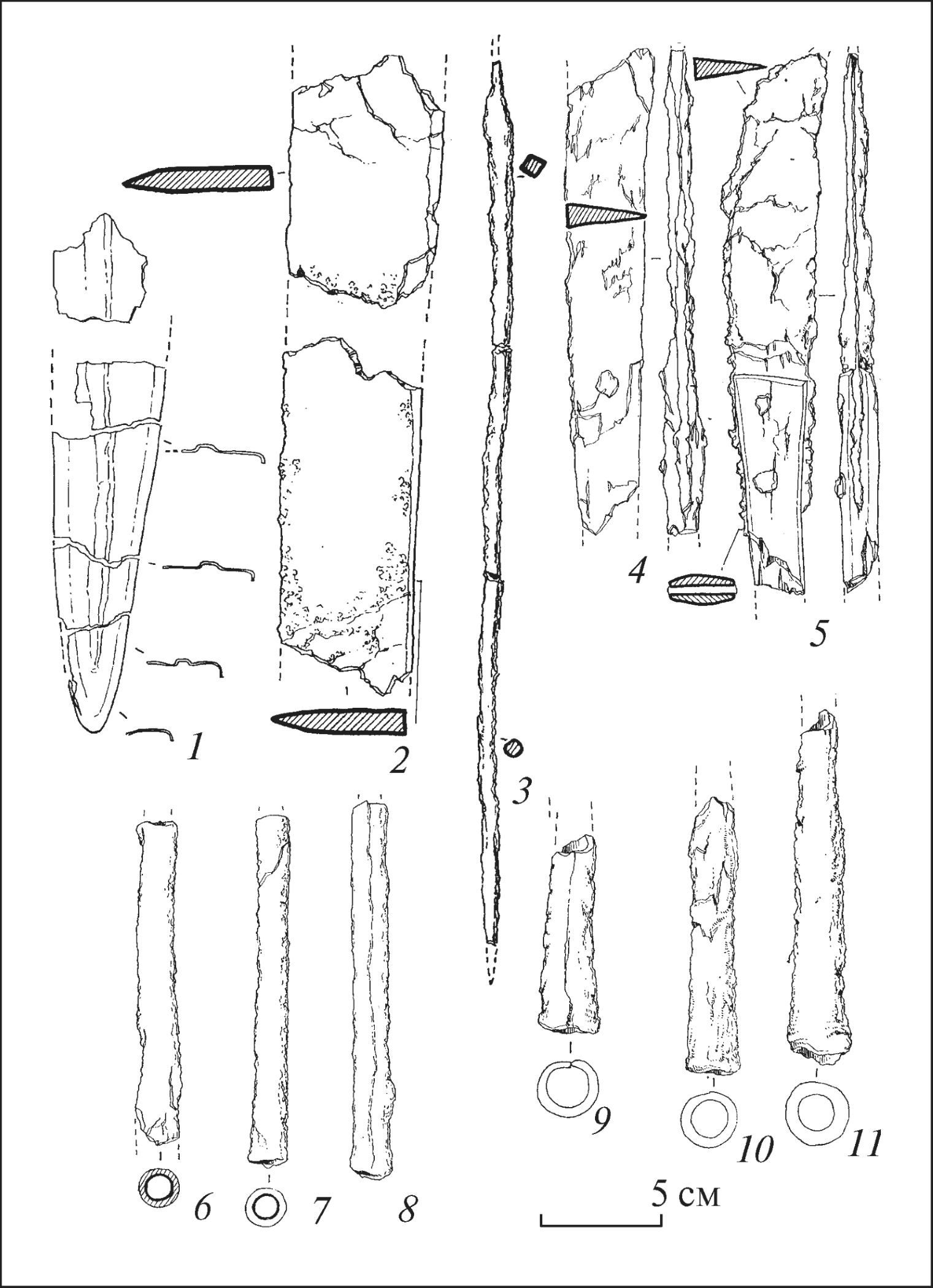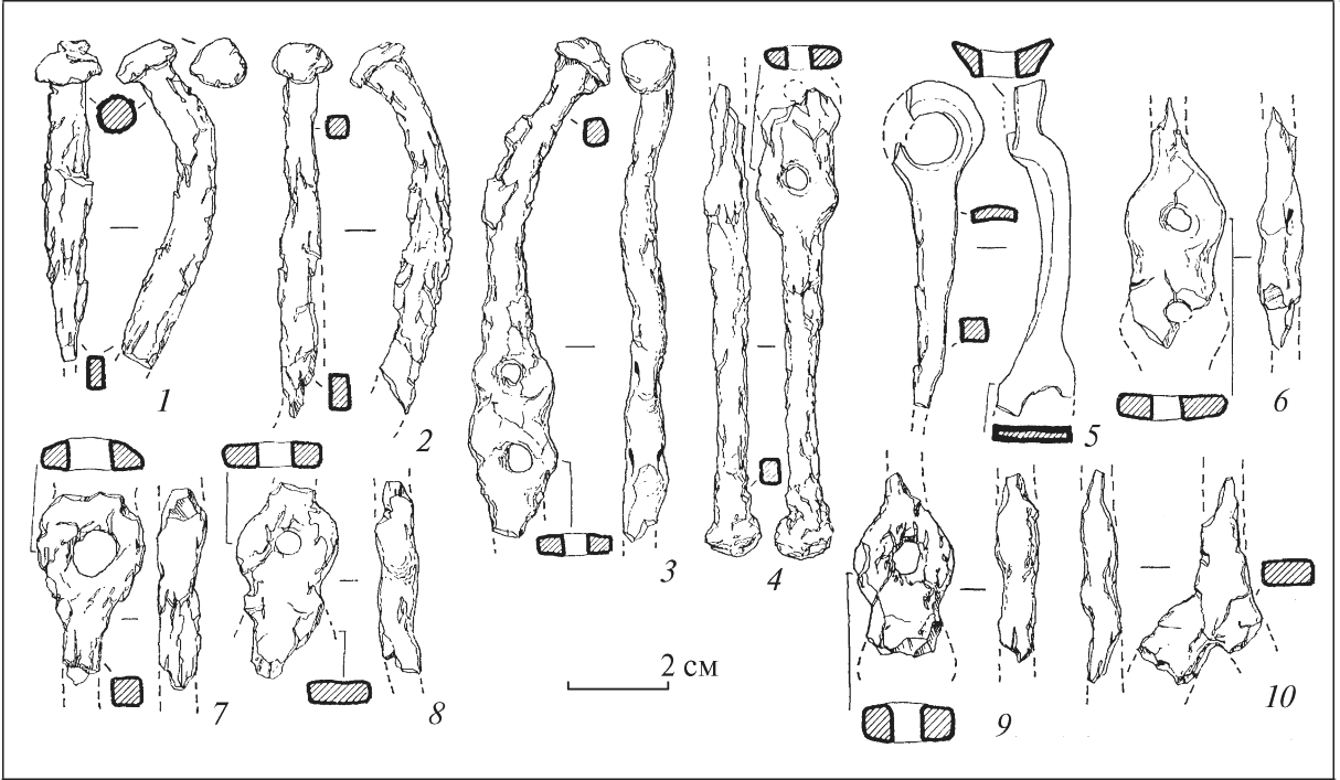 4. Нож однолезвийный железный с горбатой спиной и костяной ручкой. Ручка восьмигранная в сечении, с пазом, где двумя железными заклепками закреплено лезвие. Длина ручки 8,5 см, ширина – 2,0 см (рис. 13, 5).