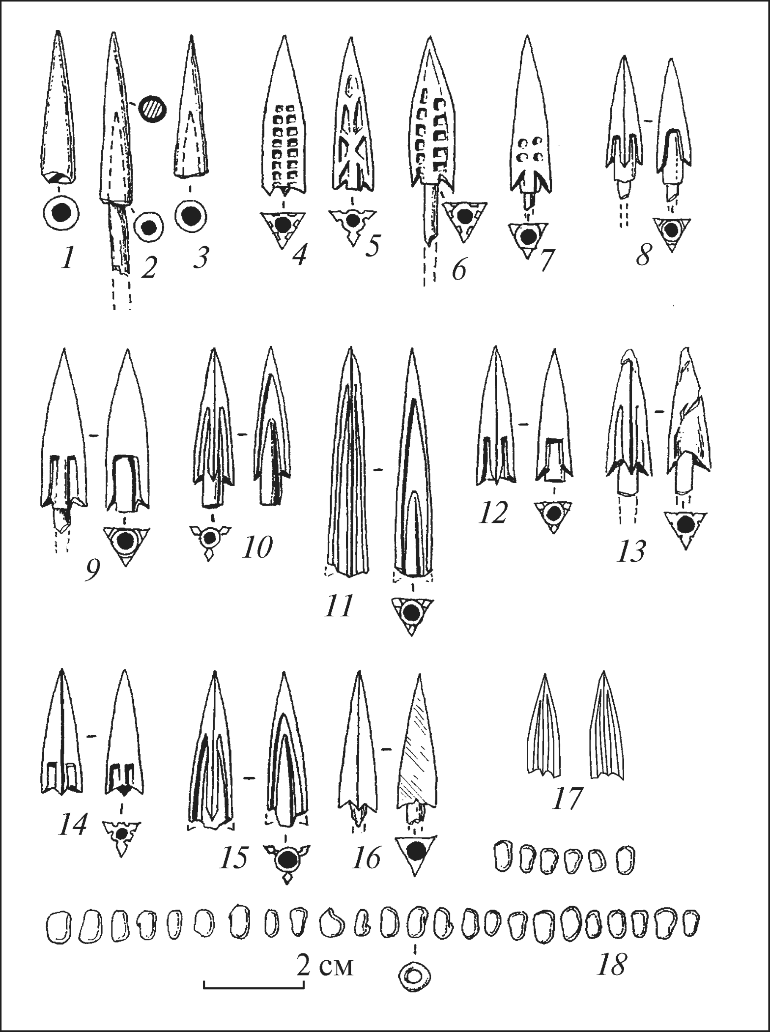 7. Второй набор состоял из шаровидных одного костяного острия (рис. 9, 1) и девяти деревянных (рис. 9, 2, 3), а также 73 бронзовых трехгранных с выдвинутой втулкой и «орнаментом» со стороны.