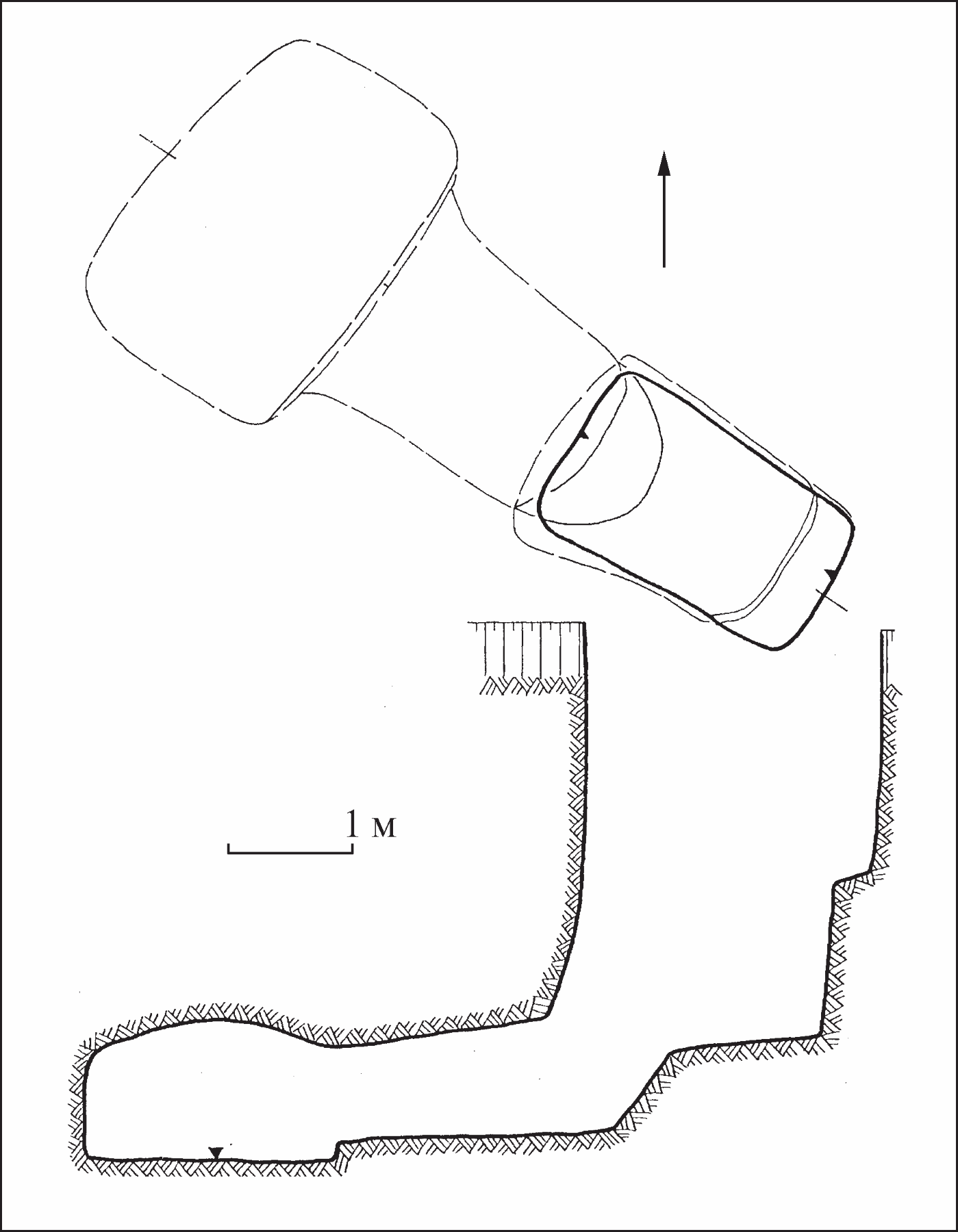 Захоронение 5 (рис. 3, 1, 5-7, 12, 2) совершенное в катакомбные. Входная яма вырыта за 4,0 м к западу от ямы могилы 4. Она прямоугольная в плане, 3,7×1,1-1,4 м, ориентирована северо-запад-юго-восток, на 0,1-0,4 м расширялась до дна. На глубине 4,6 м вдоль юго-восточной стены была ступенька шириной 0,2 м. Ниже нее дно плавно понижавлось на 0,6 м на северо-запад – к входу в дромос, достигая глубины 5,5 м. Вход арочной формы имел ширину 1,6 м при высоте 1,0 м. Перед ним выкопан ровик для фиксации завеса. Его длина 1,60 м, ширина 0,20 м, глубина 0,15 м. В погребальную камеру вел дромос длиной 1,8 м, шириной 1,6 м и высотой 0,9 м. Перед входом в камеру, в западном углу дромоса, стояли две амфоры (1, 2), еще одна была в южном углу камеры (3).