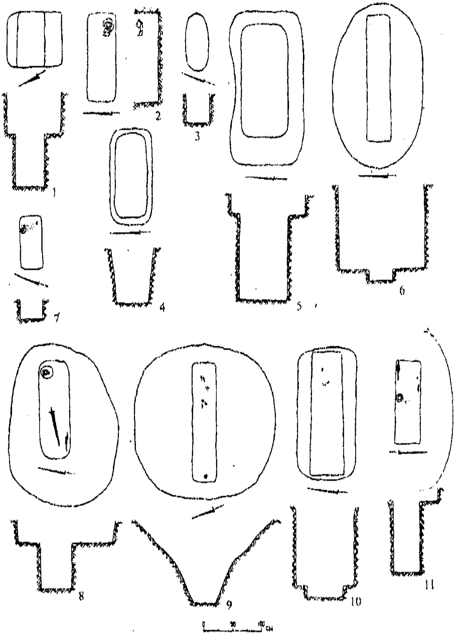 Как показали исследования, из 43 захоронений 11 погребений не содержали ни человеческих останков, ни погребального инвентаря (Рис. 1: 1-6). Могильные ямы данных захоронений на уровне их обнаружения имели в плане овальную или прямоугольную форму. Длина пятна могильных ям на уровне фиксации колебалась от 1,1 до 2,85 м, а ширина-от 1,1 до 1,56 м. В шести случаях стенки могильных ям были отвесные или имели незначительный наклон в сторону дна. Могильная яма захоронения №1/431 была снабжена заплечиками, расположенными вдоль длинных стен ямы на высоте 1,15 м от ее дна. В могильной яме погребения № 27/375 заплечики были зафиксированы по периметру ямы. Они были сделаны на 1,4 м выше дна могильной ямы. В двух случаях (№ 43/427, 44/428) на дне крупных овальных в плане могильных ям были зафиксированы углубления прямоугольной формы под тела погребенных глубиной, соответственно, 0,2 и 0,1 м. Глубина могильных ям данной группы захоронений зависела от размеров могильного пятна на уровне фиксации. Чем больше могильное пятно, тем глубже погребальная яма. Глубина данных могильных ям колебалась от 1,4 м (погр. №12/360, 19/367, 39/423) до2,7 м (погр. № 43/427). Вкачестве важного элемента погребального обряда следует отметить случаи обнаружения в заполнении могильных ям разнообразных вещей. Так, в заполнении могильной ямы погребения №1/431 была обнаружена придонная часть салтовского кухонного горшка, древесный уголь и кальцинированная косточка, в заполнении погребения №12/360 – развал салтовского столового кувшина, в заполнении погребения №19/367 – нижняя часть салтовского кухонного горшка и обломок точильного бруска, в заполнении захоронения №27/ 375 – фрагмент железного черешкового ножа, а в заполнении погребения № 39/423 – лепной салтовский кухонный горшочек.