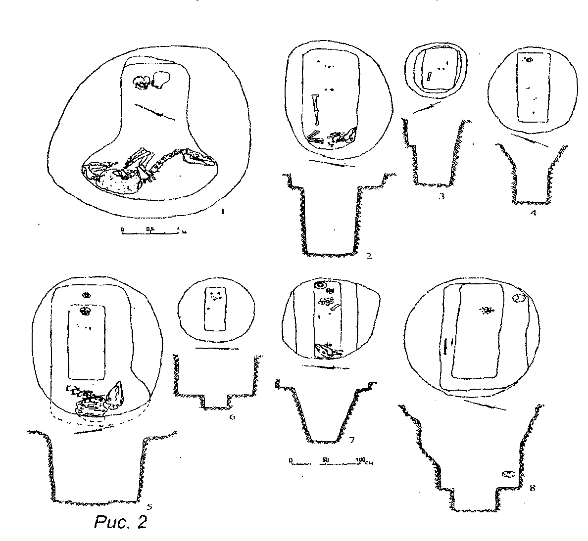 В 17 захоронениях, наряду с погребальным инвентарем, были зафиксированы человеческие останки, представленные в основном фрагментами черепа или зубами (Рис. 2: 1-8). Лишь в некоторых случаях (погр. № 3/343, 5/345, 7/347, 9/249, 14/362) в могилах каходились и отдельные трубчатые кости погребенных людей. По своим размерам и конструктивным особенностям могильные ямы данных захоронений ничем не отличаются от ям зыше описанных захоронений могильника, содержащих только погребальный инвентарь без костных человеческих останков. Следует только заметить, что глубина большинства захоронений данной группы колеблется в пределах 2,4-2,7 м от уровня современной поверхности. К тому же, в погребениях №3/343 и 35/413 в ножном торцовом краю могильных ям были зафиксированы подбои, в которых в первом случае находился костяк целого коня с седлом, а во-втором – череп коня с седлом и другим конским снаряжением. Части коня (череп и кости ног) и конская сбруя были обнаружены еще в захоронениях №5/345, 32/380, а в погребениях №26/ 374, 46/431 находилось только конское снаряжение (удила, стремена, сбруйные пряжки и т.д.). В этой группе захоронений также представлены погребения, в заполнении могильных ям которых были обнаружены древесные угольки (погр. №4/ 344, 6/346, 7/347), единичные кальцинированные косточки (погр. №6/346), керамические сосуды (погр. №7/347, 26/374), отдельные кости животных (погр. №26/374). В заполнении могильной ямы погребения №46/431 был обнаружен череп человека, что можно рассматривать как свидетельство повторного проникновения в захоронение, в результате которого череп погребенного человека оказался на 0,5 м выше дна ямы.