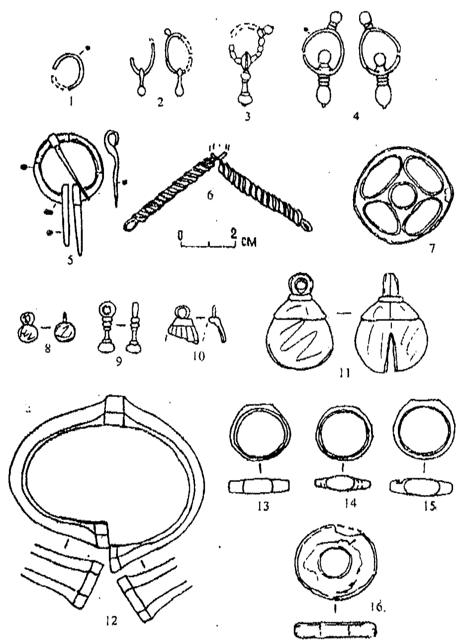 Сережки (7 экз.), выявленные в четырех захоронениях, изготовлены из бронзы или серебра, литые. Они представлены двумя видами. Первый вид – простые калачевидные (погр.№6/346) (Рис. 3: 1), второй – сережки с овальным кольцом и подвеской в виде цилиндрика с перехватом в верхней части и шишечкой на конце, кольцо в верхней части украшено маленьким шариком (погр.№5/345, 8/348,25/373) (Рис. 3:2-4). Н.Я. Мерперт и С. А. Плетнева подобные серьги датируют концом VIII - началом IX вв. [Мерперт 1951, 19-20; Плетнева 1967,142-143].