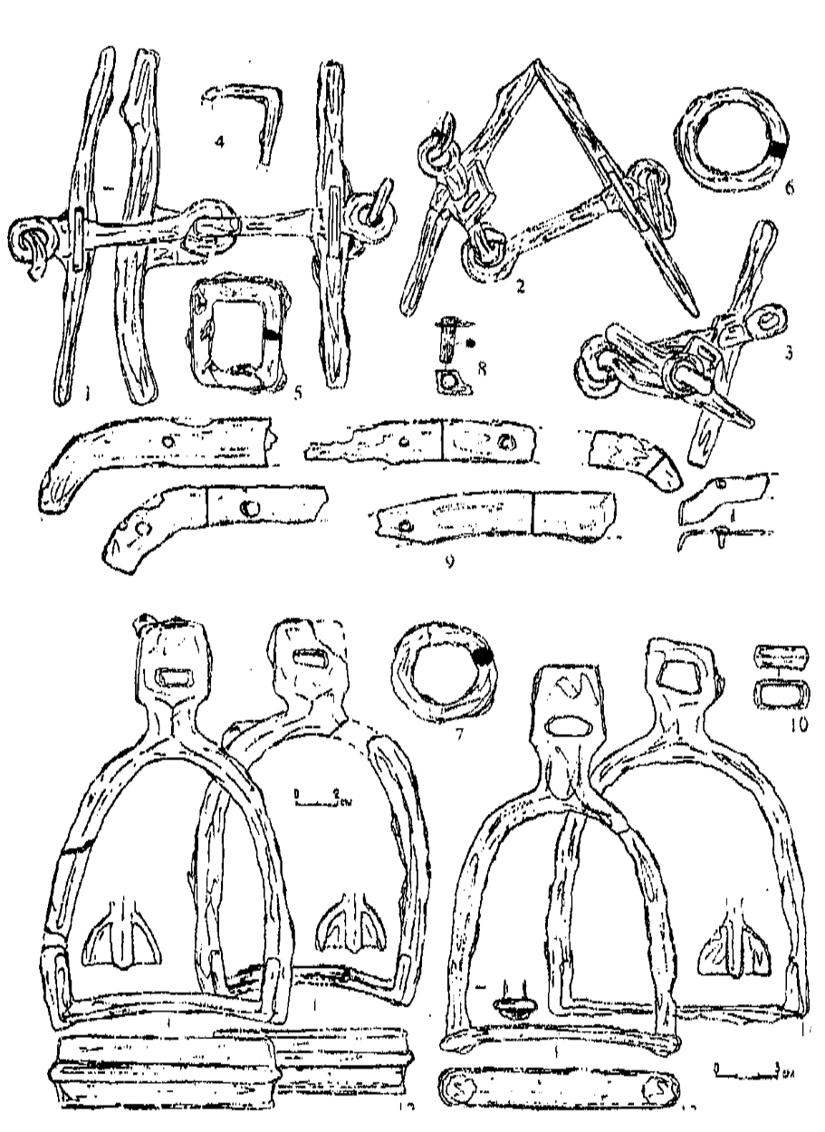 Ряд захоронений (погр.№3/343, 5/345, 13/361,26/374, 32/380, 35/413, 46/431, конь № 4) содержали принадлежности конского снаряжения. Конское снаряжение состояло из седла с железными стременами, удил, сбруйных пряжек и колец, ремней снаряжения, украшенных бляшками.