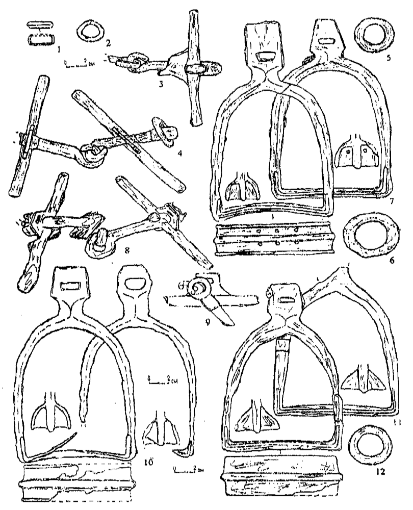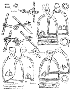 Стремена (10 экз.) выявлены в пяти погребениях. Стремена имеют арковидную форму, щиток для путолища высокий, прямоугольный, отделенный от дужки слабо выраженной перетяжкой, подножка плоская, слегка выгнутая, для прочности укреплена по середине и иногда с боков выступом-жгутом (Рис. 4: 11-14; 5: 7, 10, 11). Подножка одного стремени (погр.№3/343) украшена прорезным орнаментом из шести отверстий (Рис. 5: 7). Стремя из захоронения коня №4 имеет следы починки (Рис. 4; 13). Этоттип стремян широко известен насалтовских памятниках [Плетнева 1967,167; Крыганов, 1988].