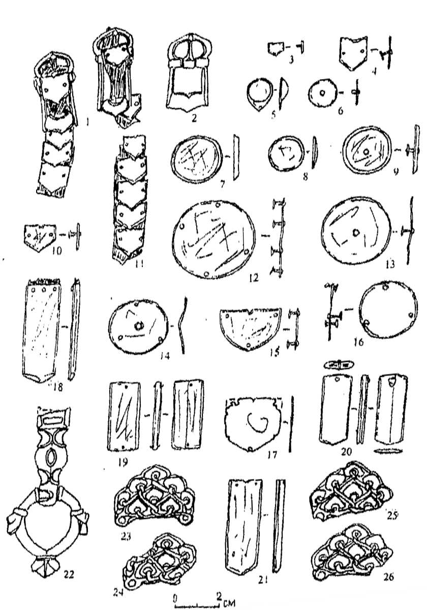Бляшки с уздечных ремней представлены двумя типами. Бляшки 1 типа от уздечных ремней выполнены путем обтягивания серебряным листом основы, от которой в большинстве случаев остается только светло-серый порошок (бронза с большой примесью цинка). Поэтому бляшки зачастую слегка выпуклые. По форме бляшки круглые (погр.№3/ 343, 13/361, 35/413) (Рис. 6: 7, 8) и листовидные (погр.№35/413) (Рис. 6: 5). Бляшки 2 типа – плоские, вырезаны из тонкого серебряного листа и прикреплены к ремням оголовья с помощью 1 -2 заклепок. Бляшки данного типа имеют форму пятиугольника (погр. №5/ 345, 13/361, 35/413, 46/431) (Рис. 6: 3, 4, 10). Бляшки почти во всех случаях сохранились с остатками кожаных ремней оголовья (Рис. 6: 1, 11). Металлические украшения ремней уздечки подобных типов широко представлены в памятниках салтовской культуры второй половины VIII - первой половины IX вв.