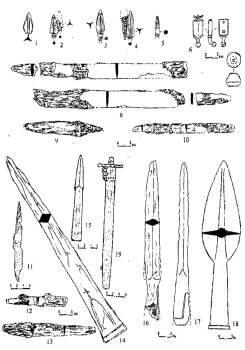 В исследованных захоронениях обнаружено пять наконечников копий (Рис. 7: 14-18). Четыре из них (погр. №2/342, 23/371, 35/413, 46431) по форме рабочей части относятся к пикам. Это втульчатые наконечники с узким длинным пером ромбического или квадратного сечения. Общая длина их колеблется от 22,0 до 35,0 см. Насад у двух наконечников плавно переходит в перо, так что плечи пера не прослеживаются (погр. №23/371, 46/431) (Рис. 7: 14, 17). Сам наконечник имеет вид клина. Еще у двух наконечников в месте перехода насада в перо более или менее резко выражены выступы (погр. №2/342, 35/413) (Рис. 7: 15, 16). Наконечники копий, выполняющие функцию пик, на территории юга Восточной Европы они получили широкое распространение c VII в. [Кирпичников 1966,17] Mixeeв, Степанська, Фомін 1967,168]. Наиболее ранние образцы наконечников пик в Восточной Европе найдены в аварских могильниках VII - первой половины VIII вв. Подунавья, а также в Поднепровье (Глодосы), в раннеболгарских комплексах второй половины VII-VIII вв. Среднего Поволжья. Н.Я. Мерперт датирует пиковидные наконечники из салтово-маяцких памятников Подонцовья серединой VIII в. [Мерперт 1951,26]. Наконечник копья из погребения №29/377 представляет собой конусообразную, во всю длину наконечника втулку с двумя боковыми крыльями, образующими перо (Рис. 7:18). Форма пера листовидная. Для салтовского времени этот тип наконечников архаичен.