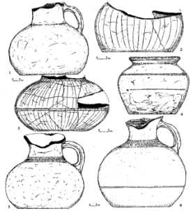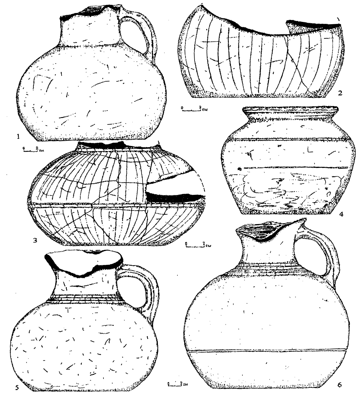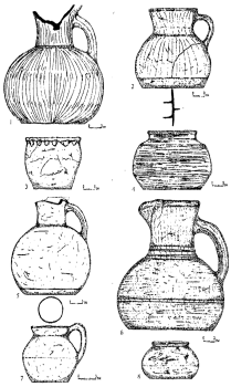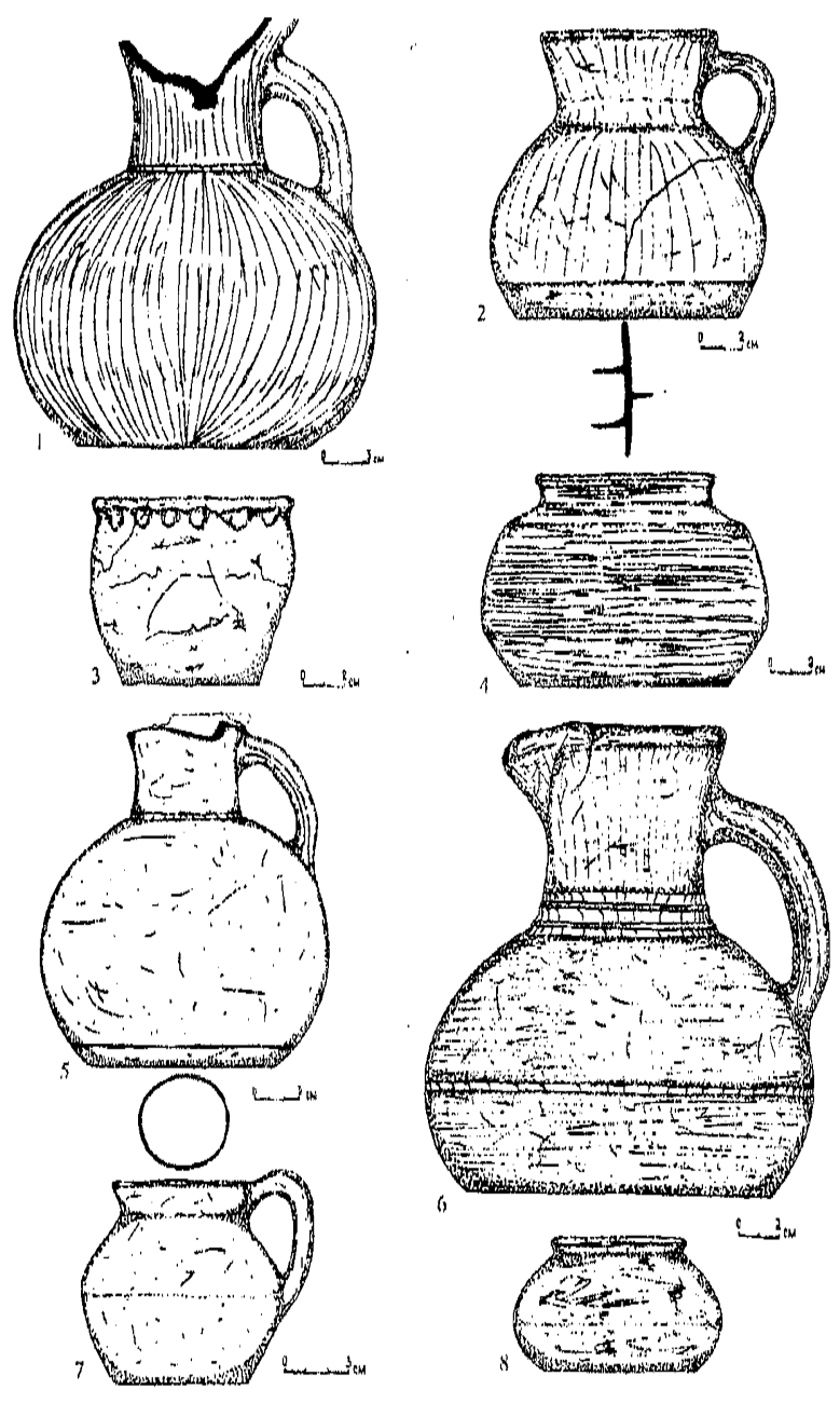 В девяти погребениях (№2/342, 3/343, 7/347,15/363,24/372, 26/374, 30/378 36/ 414, 37/421) обнаружены глиняные сосуды (Рис. 8; 9). Чаще в захоронении находился один сосуд, и только в погр.№36/ 414 их было два, а в погр. №24/372 их количество достигало четырех. В исследованных захоронениях глиняные сосуды представлены кувшинами (погр. №2/342,3/ 343, 24/372, 36/414, 37/421) (Рис. 8: 1, 5, 6; 9: 1-3, 5, 6), кружками (погр. №24/372) (Рис. 8: 2, 7), кубышками (погр.№7/347, 30/378) (Рис. 8: 4, 8), лепными горшочками (погр. №15/363) (Рис. 8: 3). Из культурного слоя могильника происходит еще один салтовский кухонный горшок (Рис. 9: 4). Все обнаруженные сосуды представлены формами, имеющими широкие аналогии в салтовских древностях Подонья.