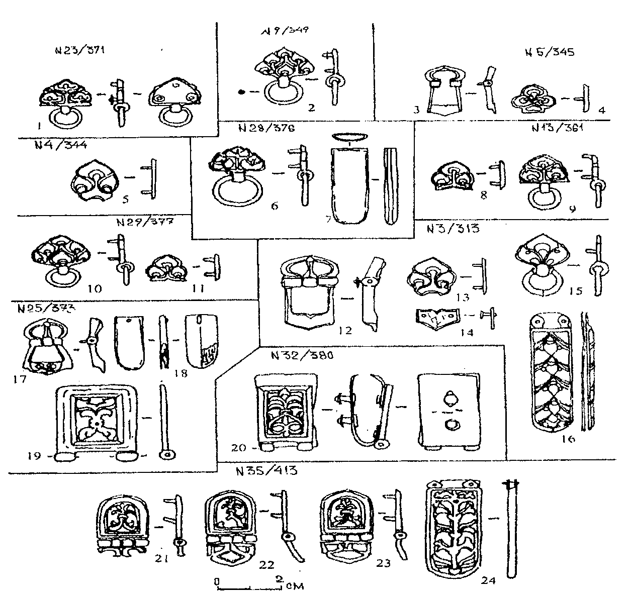В ряде захоронений (№3/314, 9/349, 13/361, 23/371, 28/376, 29/377) были представлены бляшки с щитком подтреугольной формы, снабженным в нижней части небольшим подвижным кольцом (Рис. 10: 1, 2, 6, 9, 10, 15). В ряде случаев (погр.№9/349, 29/377) щиток бляшек орнаментирован шестилепестковой пальметкой (Рис. 10: 2, 10). Данный орнаментальный мотив встречается в основном на изделиях середины IX в. [Фонякова 1986, рис. 4: 11]. Поле бляшек из погребений №13/361,23/371, 28/376 украшено орнаментом в виде трех цветков лотоса, помещенных на разновысоких стеблях (Рис. 10: 1, 6, 9,15), что позволяет датировать данные изделия серединой - третьей четвертью IX вв. [Фонякова 1986, рис. 4: 8, 9, 12, 13]. Орнамент на щитке бляшки с подвижным кольцом из захоронения №3/313 (Рис. 10: 15) соответствует стилю изделий конца VIII - начала IX вв. [Фонякова 1986, рис. 4: 6].