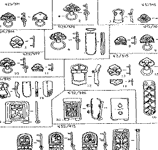Седла. Остатки седел выявлены в двух погребениях (№3/343, 35/413). Судя по ним, седла были твердые, с высокими вертикальными луками. Такие седла были наиболее распространены в VII-VIII вв. [Амброз 1973, 98, рис. 5: 2]. Передняя лука укреплялась железной оковкой. Оковки луки седла имеют трапециевидную форму (Рис. 4: 9). Они фепятся к деревянной луке с помощью 3-6 железных заклепок (Рис. 4: 8). Аналогии нашим оковкам хорошо известны на могильниках VIII-IX вв, аланского варианта салтов-ской культуры [Крыганов 1993, рис. 1:10; Плетнева 1989, рис. 43].
