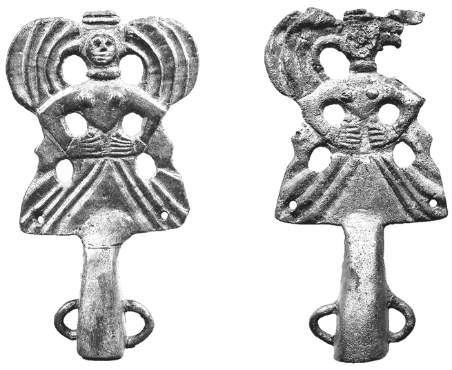 При сравнении двух наверший обнаруживаются незначительные различия как в размерах (эрмитажный экземпляр превышает «харьковский» по высоте и ширине на 0,4 см), так и в ряде иконографических деталей, что, в целом, характерно для подобных серийных изделий, отливаемых по утрачиваемой восковой модели [45, с. 259]. Для нашего случая наибольший интерес представляют различия в оформлении кистей рук крылатого божества. На эрмитажном экземпляре сомкнутые на животе кисти рук анатомически условно точны – четыре пальца каждой кисти имеют равную длину, а большие пальцы заметно короче и к их кончикам примыкают кружочки, интерпретируемые как окончания «змеевидных завитков с головками животных на концах» [46, с. 68, 69] либо «головки змей» [47, с. 167]. Оформление кистей рук на «харьковском» навершии совершенно иное – левая кисть четырехпалая, правая — пятипалая, причем пальцы обеих кистей примерно одной длины. Кружки расположены поверх кисти, у самого края талии.