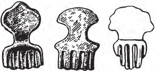 Скифские бляшки в форме лапы животного гребневидные, в виде лапы животного (I.2.4) гребневидные – с фигурной грибовидной верхней частью и пятью зубцами поздние – с отсутствием обрамления, геометризацией формы лапы/руки, более плоским рельефом