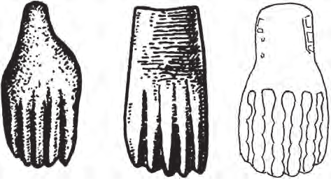 Скифские бляшки в виде кисти руки в виде кисти руки (I.4.2) 2 вариант – кисть человеческой руки, с укороченным большим пальцем, иногда – рельефно моделированными ногтями