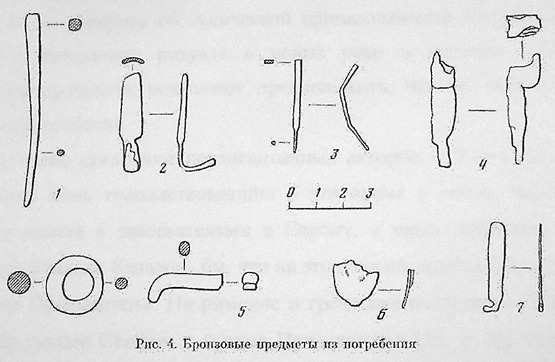 Вместе с описанными предметами обнаружено несколько фрагментов других изделий из бронзы: шиловидный формы бронзовый прут, круглый в сечении, расширяющийся коней обломан, в сечении квадратный (рис.4,1); бронзовая скобка с обломанным концом, изготовлена из плоской пластины, округлой в сечении (рис.4,2); обломок изогнутого прута, прямоугольного в сечении; один конец обломан, другой, в сечении круглый, заострён (рис.4,3); сильно окислившийся, расслаивающийся бронзовый фрагмент с изгибом (рис.4,4); половина овальной пластинки, имевшей бугорок на слегка выпуклой внешней поверхности (рис.4,6); плоская пластина прямоугольной формы, с обломанным крючком на одном конце (рис.4,7).