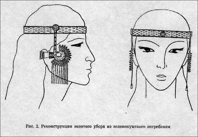 Нечто подобное можно видеть на женском изображении из тюрского кочевнического могильника Кудыргэ [13, рис. 18; 14, рис.4]. Могильник датируется временем, близким к гуннскому, – V-VI вв. [14,c.48]. Женщина здесь роскошно одета и имеет тиару на голове. По обеим сторонам лица висят массивные украшения, изображённые очень схематично. Видимо, так одевались женщины тюрской знати и гуннские царицы.
