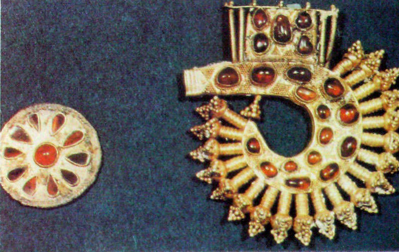 Из него происходят два золотых украшения с вставками из альмандинов и с зернью.